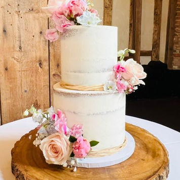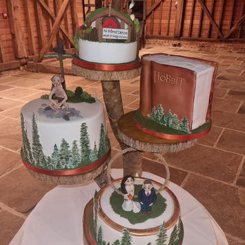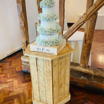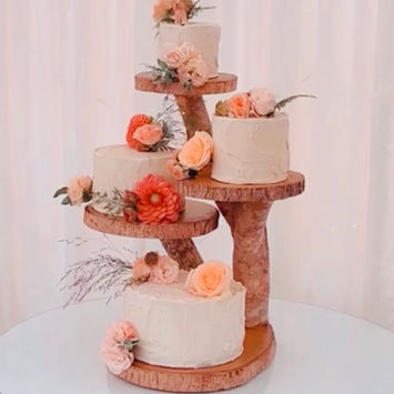 Rustic dark wood gold hooped hexagonal cake stand with flowers