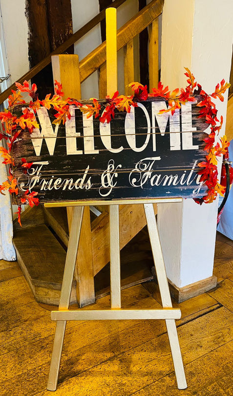 Welcome friends and family sign with gold easel and garland